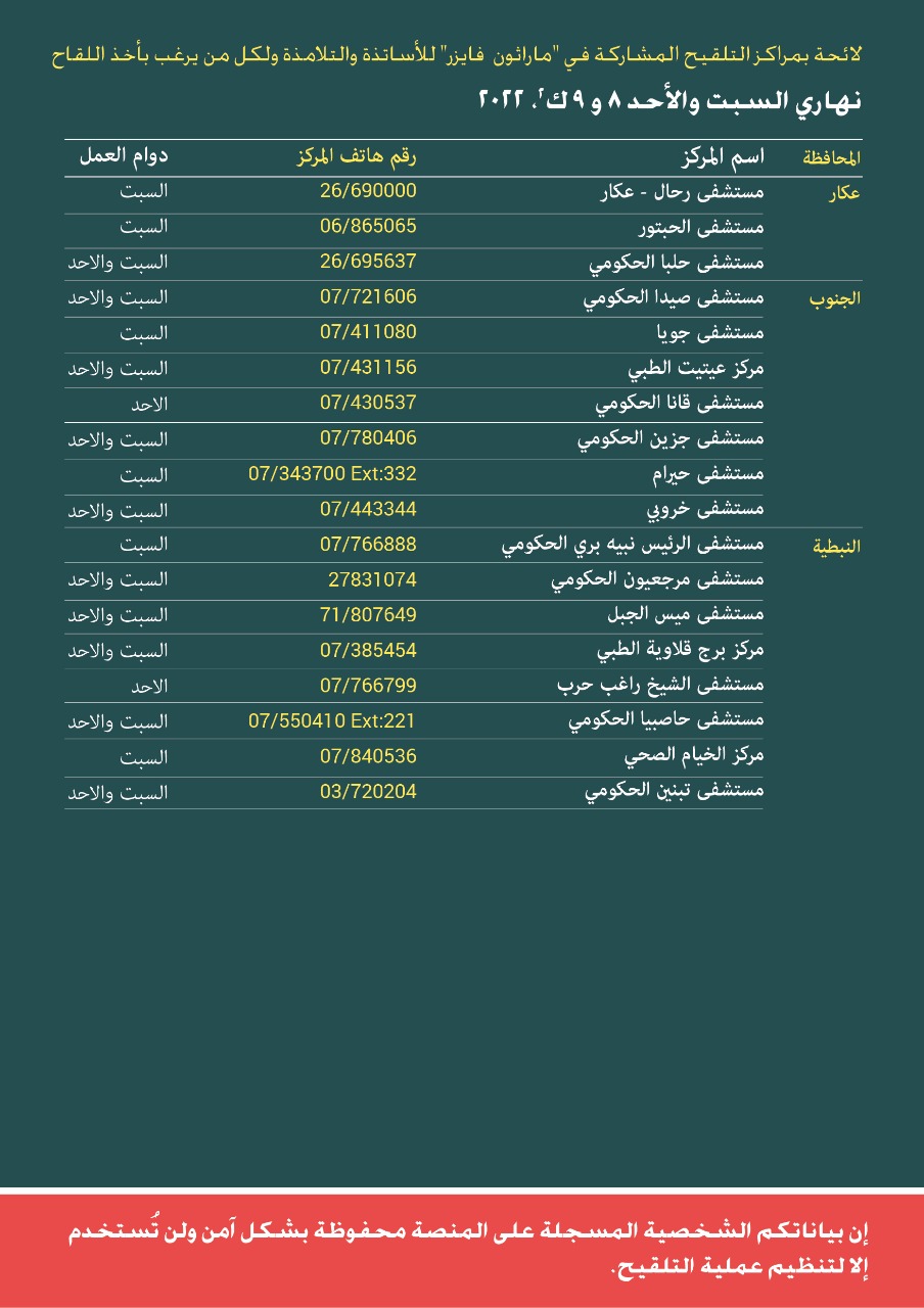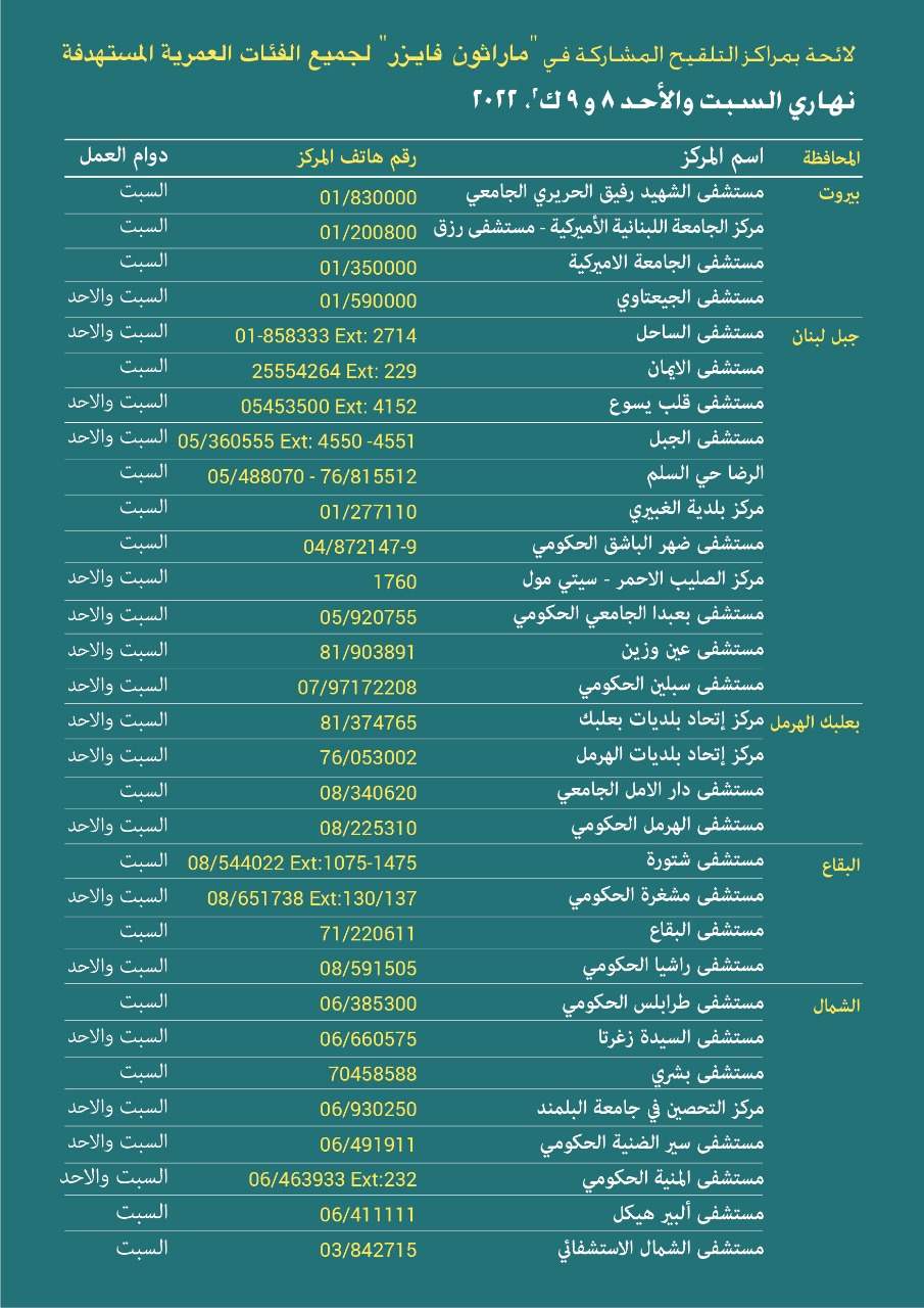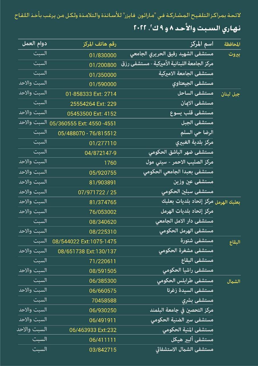 وزعت وزارة التربية والتعليم العالي لائحة بمراكز التطعيم التي ستستقبل الطلاب والأساتذة وكل من يرغب بتلقي اللقاح المضاد لـ”كورونا”، وذلك وذلك ضمن ماراثون “فايزر”.