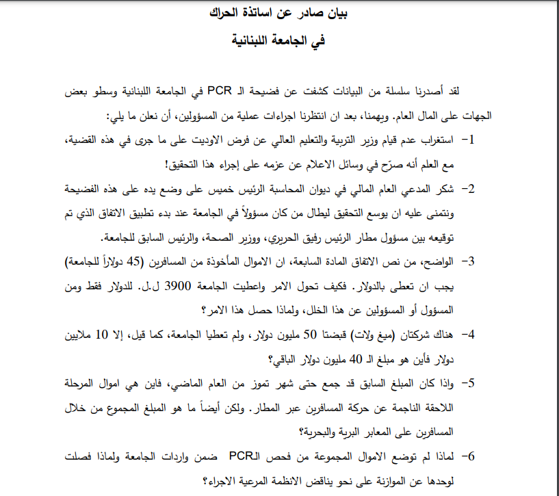 تابع اساتذة الحراك في الجامعة اللبنانية قضية ما اعتبروه فضيحة الـpcr في الجامعة اللبنانية، وصدر عنهم البيان التالي:
