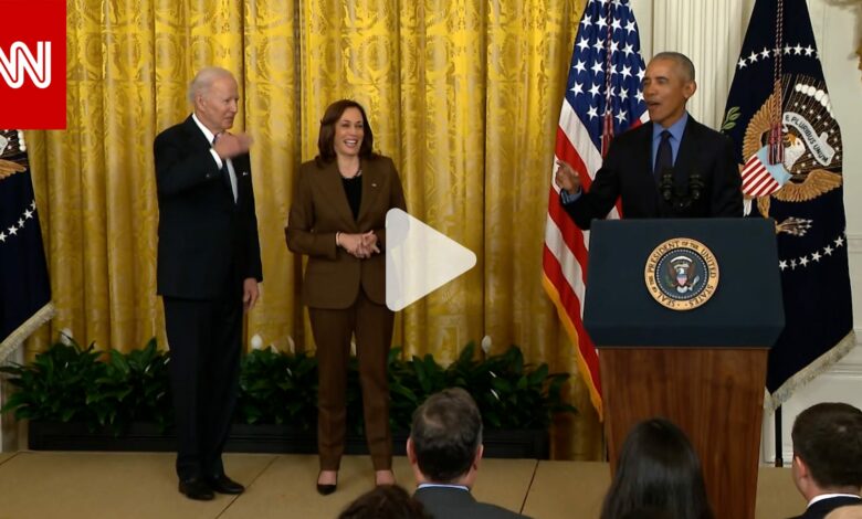 ووصف أوباما في كلمته الرئيس بايدن بـ”نائب الرئيس”، قبل أن يتوقف للحظة، ما أثار موجة من الضحك بين الإعلاميين الذين كانوا في القاعة.