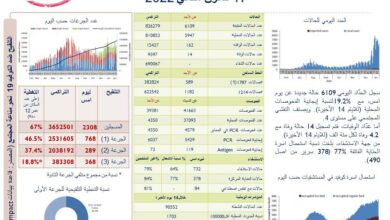 أعلنت وزارة الصحة العامة في تقريرها اليومي تسجيل “1009 إصابة جديدة بفيروس كورونا رفعت العدد التراكمي للحالات المثبتة الى 1204106، كما تم تسجيل 3 وفيات”.