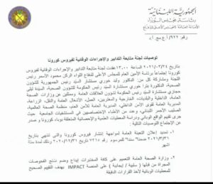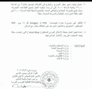 صدر عن لجنة متابعة التدابير والاجراءات الوقائية لفيروس كورونا، التي اجتمعت برئاسة الامين العام للمجلس الاعلى للدفاع اللواء الركن محمود الاسمر بتاريخ 24-3-2021 توصيات جديدة، أبرزها تمديد إعلان التّعبئة العامة لمدة 6 اشهر اضافية.