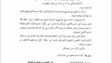 وأملت أن “يشكل عيد الاضحى كما سائر المناسبات الدينية والروحية، محطة للبنانيين عامة والمسلمين خاصة، لاستلهام قيم الوحدة والتضحية في مواجهة التحديات التي تواجه لبنان على مختلف المستويات، والتأسيس لقيامة حقيقية للبنان وطنا نهائيا لجميع أبنائه”.