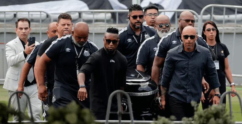 سُجي جثمان أسطورة كرة القدم البرازيلية، بيليه، الاثنين، في ملعب نادي سانتوس البرازيلي، الذي شهد انطلاقة اللاعب الراحل نحو النجومية في عالم كرة القدم.
