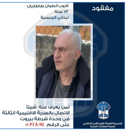 لذلك يُرجى من الذين شاهدوه ولديهم أي معلومات عنه أو عن مكانه، الاتصال بالسرية الإقليمية الثالثة في وحدة شرطة بيروت على الرقم 328094-01 أو 328093-01، للإدلاء بما لديهم من معلومات.