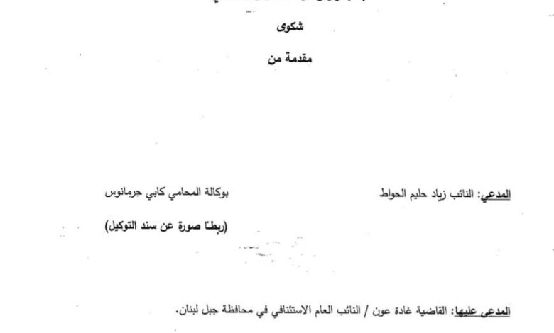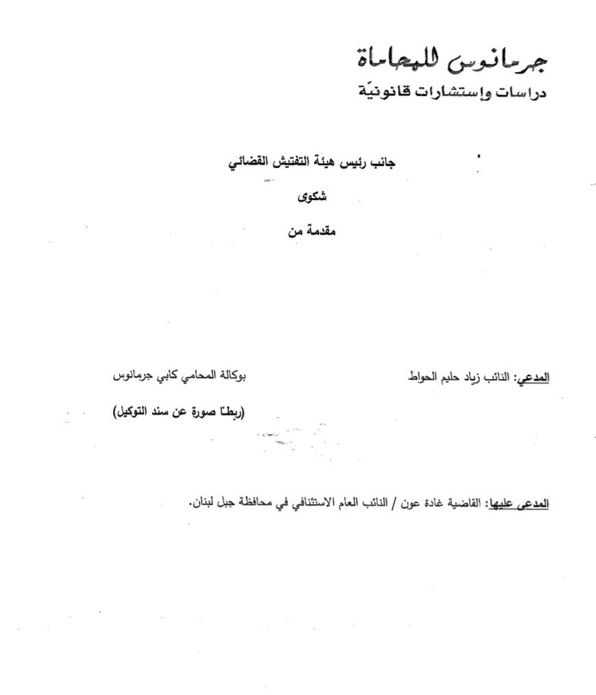 تقدم النائب زياد الحواط بواسطة وكيله المحامي غابي جرمانوس بشكوى أمام هيئة التفتيش القضائي بوجه النائب العام الاستئنافي في جبل لبنان القاضية غادة عون لاخلالها بما يفرضه قانون القضاء العدلي من موجبات ترتبط بسلوكية القاضي ولمخالفتها أحكام المادة ٣٩ من الدستور اللبناني .