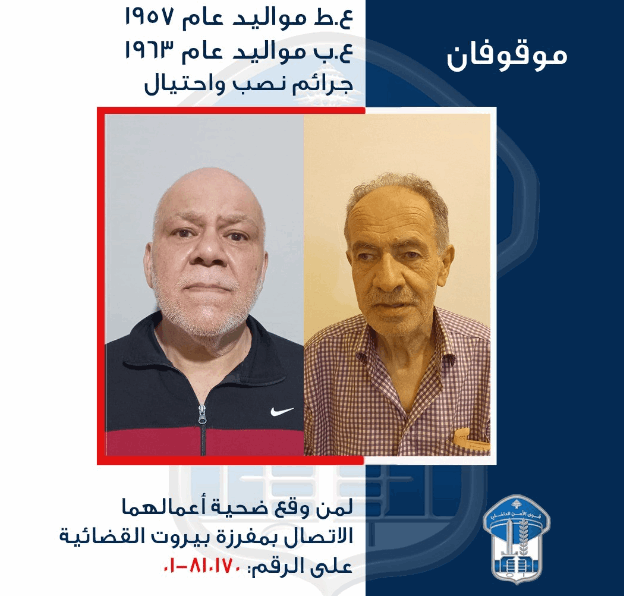 لــذلك، وبناءً على إشارة القضاء المختص، تُعمِّم المديريّة العامّة لقوى الأمن الدّاخلي صورتيهما، وتطلب من الذين وقعوا ضحيّة أعمالهما وتعرّفوا إليهما الحضور إلى مركز مفرزة بيروت القضائيّة الكائن في مبنى ثكنة بربر الخازن – فردان، أو الاتصال على الرقم: 810170-01، تمهيداً لاتخاذ الإجراءات القانونية اللّازمة.