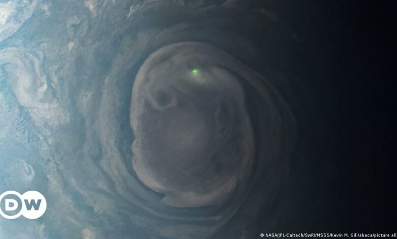 أظهرت صورة من كوكب المشتري التقطتها جونوكام JunoCam التابعة لوكالة ناسا لأبحاث الفضاء نقطة خضراء لامعة في القطب الشمالي للكوكب، ما أثار اهتمام وفضول العلماء.