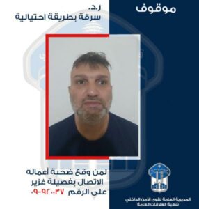 لذلك، وبناءً على إشارة القضاء، تُعمِّم المديرية العامة لقوى الأمن الداخلي صورته، وتطلب من الذين وقعوا ضحية أعماله، وتعرّفوا إليه، الحضور الى مركز الفصيلة المذكورة الكائن في ساحة غزير، أو الاتصال على الرقم: 920037-09، تمهيداً لاتخاذ الإجراءات القانونية اللّازمة.
