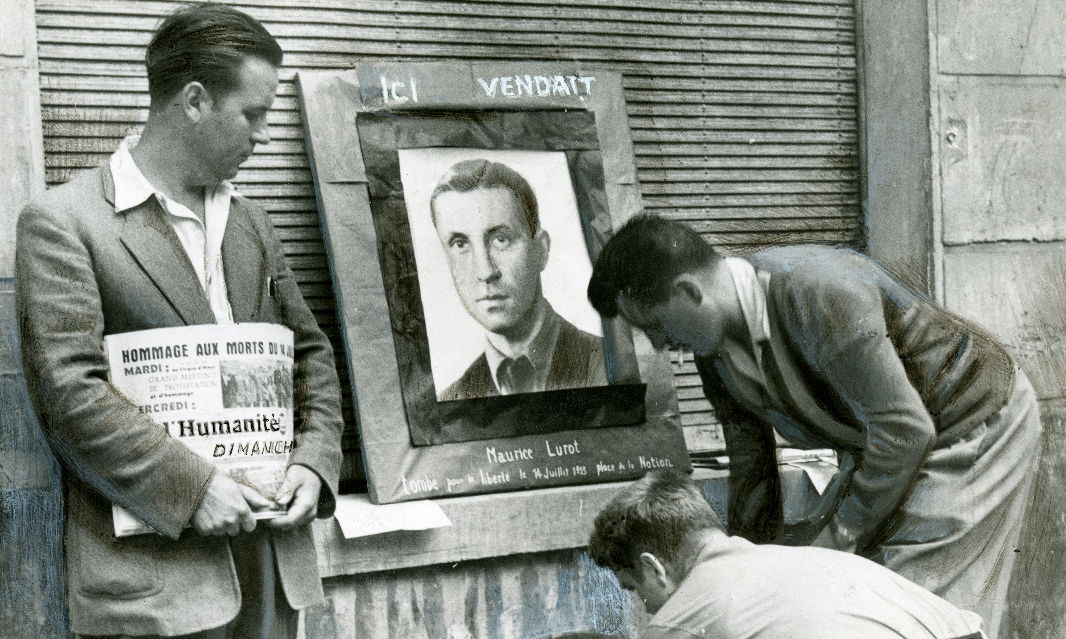 بورتريه لموريس ليرو، أحد ضحايا مأساة 14 يوليو، مثبت في المكان الذي اعتاد فيه بيع “لومانيتيه” كل يوم أحد، يوليو 1953، ذاكرة لومانيتيه، أرشيف مقاطعة سين سان دوني”