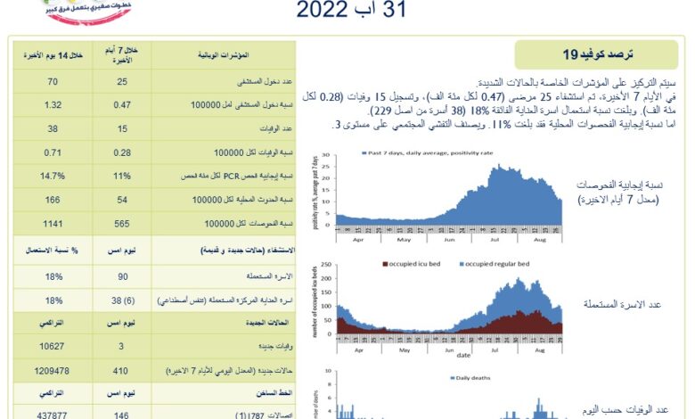 أعلنت وزارة الصحة العامة عن تسجيل 410 إصابات جديدة بفيروس كورونا ليرتفع العدد التراكمي للإصابات منذ بدء انتشار الوباء إلى 1209478.