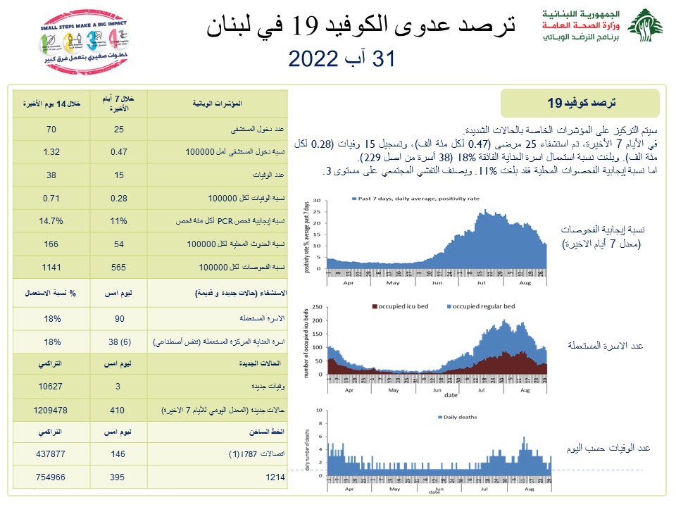 كما وسجل لبنان ثلاث حالات وفاة ما رفع العدد التراكمي للوفيات إلى 10627.