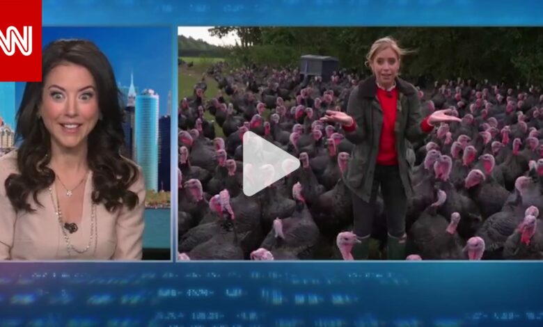 تراسل آنا ستيوارت من CNN من مزرعة ديوك رومي، في إسكس في جنوب إنجلترا، حيث يقومن الديوك بإلقاء تحية إليها أثناء البث المباشر.