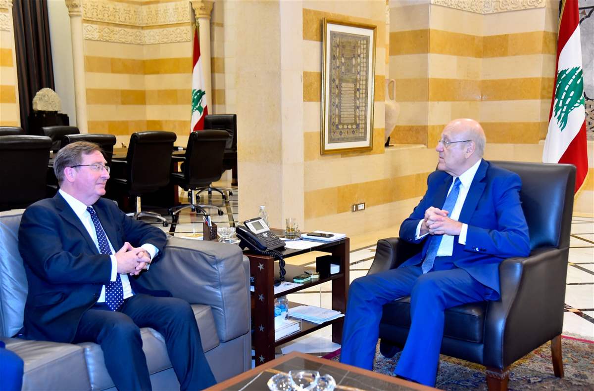 واستقبل الرئيس ميقاتي سفير بريطانيا في لبنان هاميش كويل على رأس وفد، وكانت جولة افق عن العلاقات الثنائية بين البلدين والاوضاع الراهنة في المنطقة.