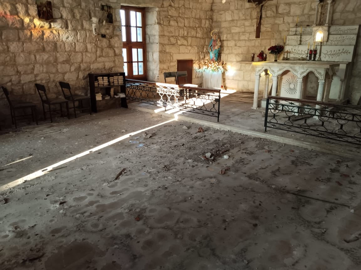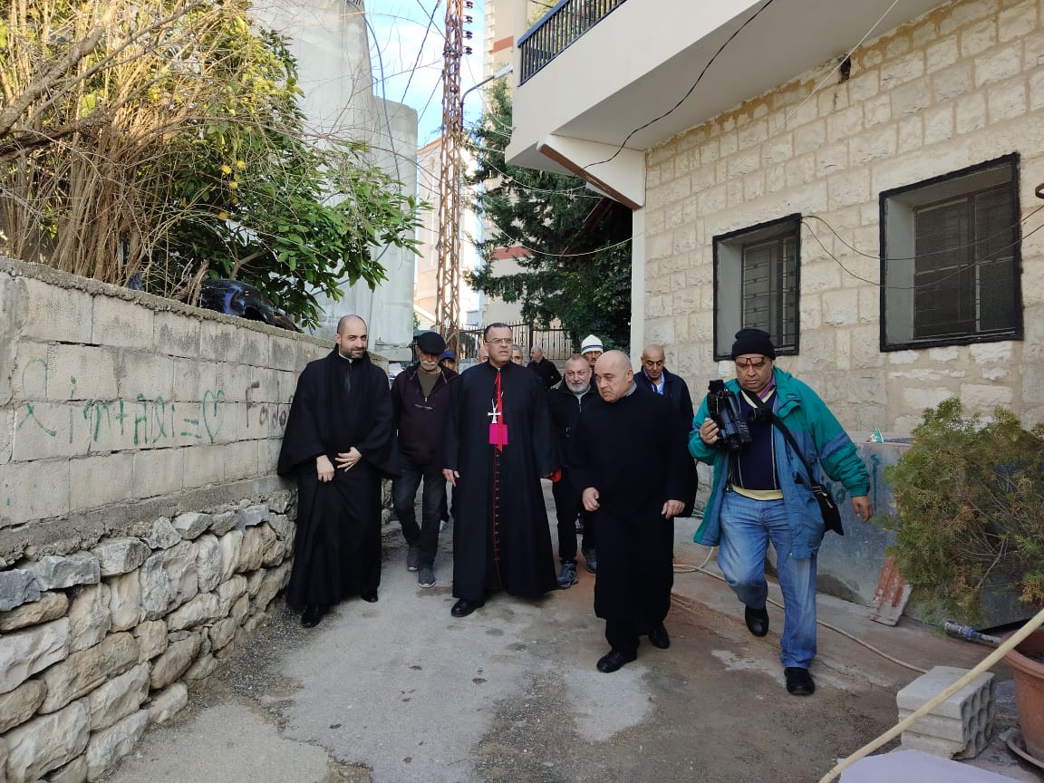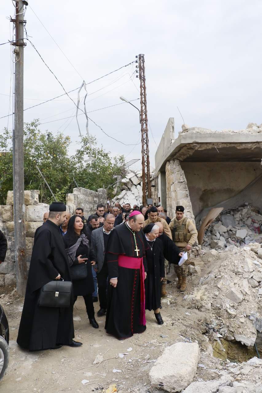 في السياق عينه تابع السفير البابوي البرنامج المقرر برفقة الكهنة والراهبات الانطونيات وسار مشيا على الاقدام متفقّدًا المنازل الّتي قُصفت خلال الحرب الاسرائيلية، وعاين المنازل المدمّرة والمتضررة بشكل جزئي وصولا الى الكنيسة الاثريّة، حيث فوجئ بالاضرار الكبيرة الّتي اصابتها من الخارج والداخل وبات سقفها آيلا للسقوط في أي لحظة. وكانت كلمة للخوري يوسف سمعان جاء فيها: “حزينةٌ كنيستنا على غير عادتها. أنينها وصراخها كراحيل الّتي تبكي وتأبى أن تتعزّى. مجروحةٌ في صميمها ومتألّمة ودامعة، فما بعد صباح الأحد 29 أيلول الماضي ليس كما قبله. ما أصاب الكنيسة أصابنا جميعًا.