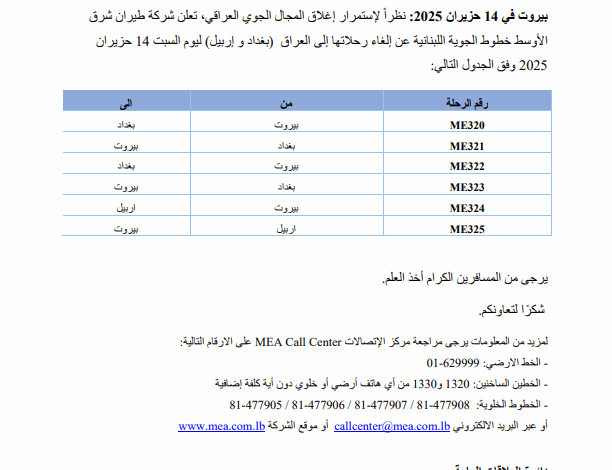 أعلنت شركة “طيران الشرق الأوسط” في بيان أنه “نظراً لإستمرار إغلاق المجال الجوي العراقي، نعلن عن إلغاء رحلاتنا إلى العراق (بغداد و إربيل) ليوم السبت 14 حزيران”.