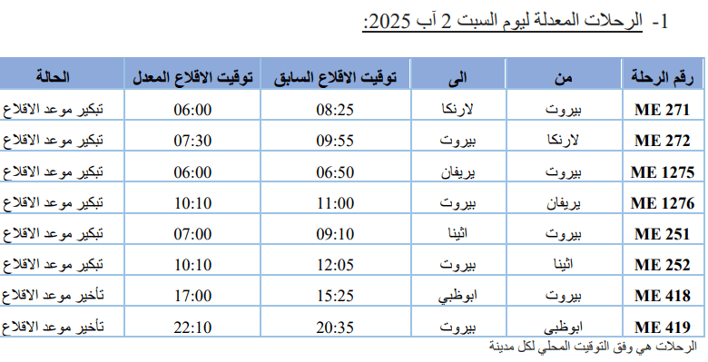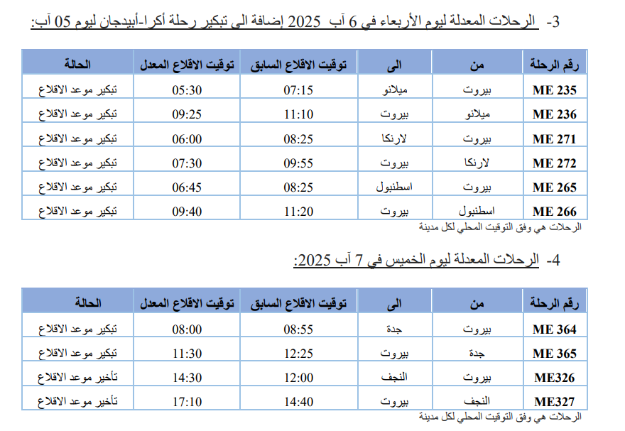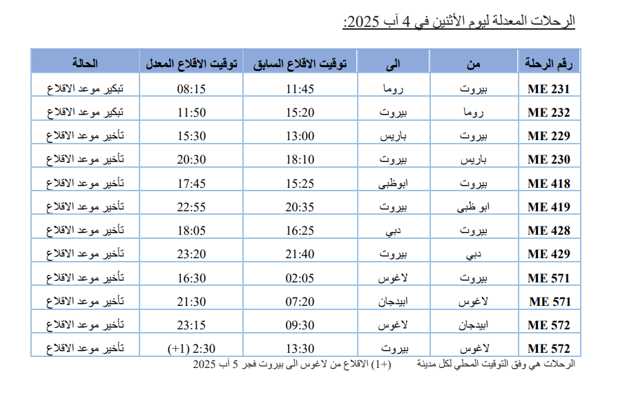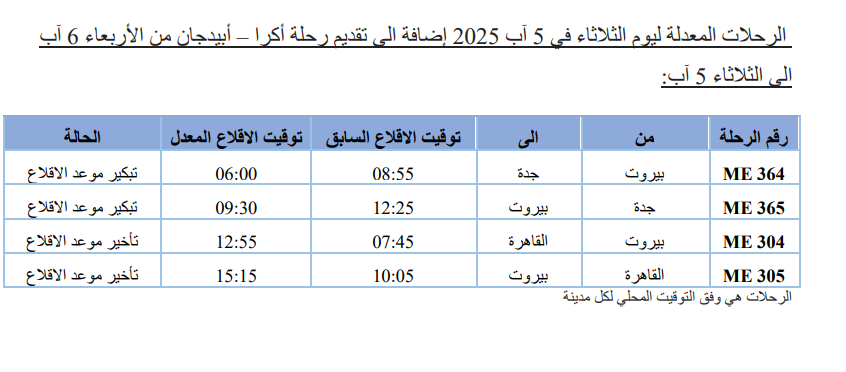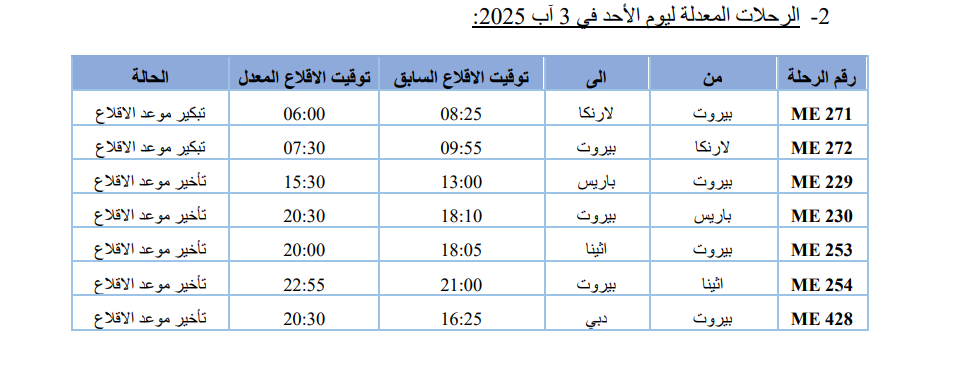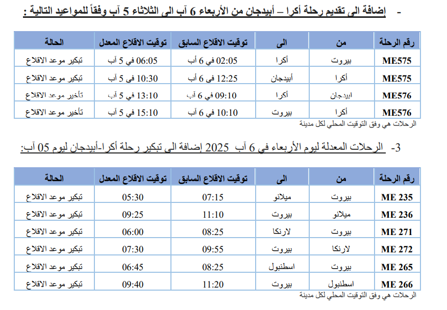 عطفًا على البيانين الصادرين بتاريخ 29 و 30 تموز 2025 بشأن تعديل جدول رحلات شركة طيران الشرق الأوسط – الخطوط الجوية اللبنانية، تعلن الشركة عن إجراء تعديلات إضافية