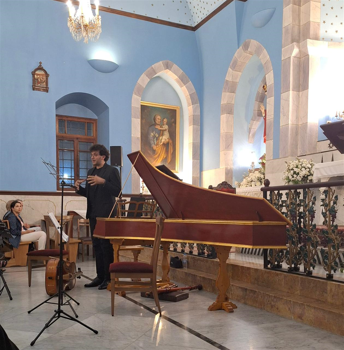وقد تألق في هذه الليلة الباريتون ماريو تحتوح بأداء غنائي مفعم بالإحساس، رافقه على آلة الكلافسان جو ضو بإتقان مدهش، وعلى آلة الفلوت فريد رحمة بنفحاته الهادئة، وعلى آلة الشيلو نايري غزاريان بعزف عميق أضفى دفئًا على أجواء الكنيسة التاريخية.