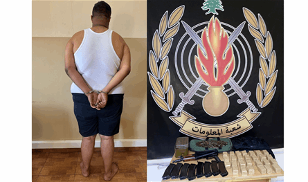 أضاف البلاغ:” بتاريخ 26-08-2025، وبعد عملية رصد ومراقبة دقيقة، تمكنت إحدى دوريات الشعبة من توقيفه في محلة كفرحيم، أثناء قيادته سيارة من نوع “كيا” لون بني، تم ضبطها. وخلال محاولة توقيفه، حاول الفرار وشهر مسدّسًا باتجاه عناصر الدورية، ما اضطرهم إلى إطلاق النار على إطارات السيارة لإجباره على التوقف. بتفتيش منزله، ضبطت في داخله بندقية حربية، وذخائر، وجعبة عسكرية”.