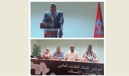 وقال: “ان عمالا قد قضوا ايضا في غزة وهم يتمسكون بأرضهم وبفرص عملهم وحياتهم ولكن النار كانت اسرع اقرب اليهم من حبل الوريد. فدعونا نقف اليوم لحظة وجدانية لصالح غزة وعمال غزة وابناء غزة، عسانا نعطيهم شيئا مما يستحقون ولو بشكل معنوي ومن هنا أعلن كامل تضامننا مع عمال وشعب فلسطين مطالبين كقوة شعبية أممية بوقف إطلاق النار وإقامة دولة فلسطين المستقلة وعاصمتها القدس. وكذلك لا ننسى القصف العشوائي على اليمن وبناها التحتية والموانئ البحرية والطاقة الكهربائية”.