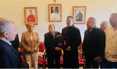 وفي الختام قدم الاب طربية كتابا عن القديس شربل باللغات الأربع هدية تذكارية لكل من عون وباسيل .