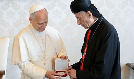 قدم الراعي لقداسته درع البطريركية المارونية وهدية من لبنان عبارة عن صندوق من خشب الأرز، وفيه من منتوج جزين طقم السفرة الكامل المزخزف بالعلم اللبناني، وقد حفر على الصندوق باللغة الإيطالية ما معناه: ” يُقدم إلى قداسة البابا لاون الرابع عشر من الكاردينال مار بشارة بطرس الراعي، تشرين الأول ٢٠٢٥”.