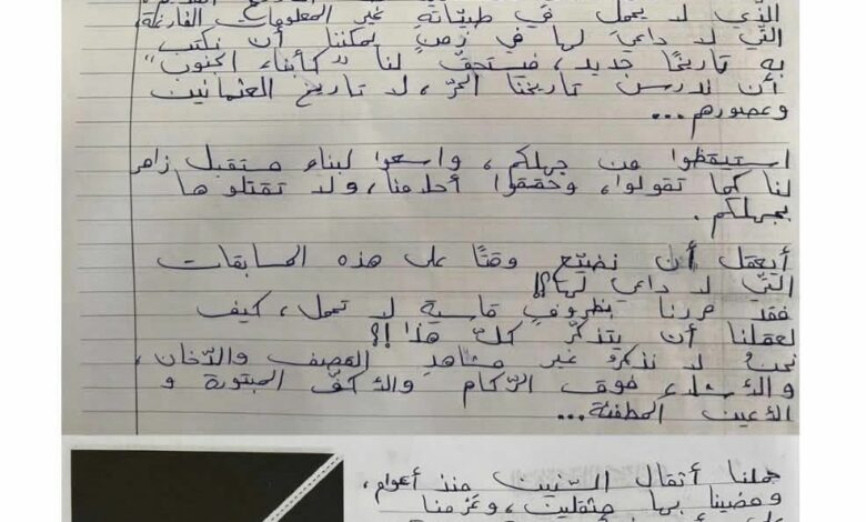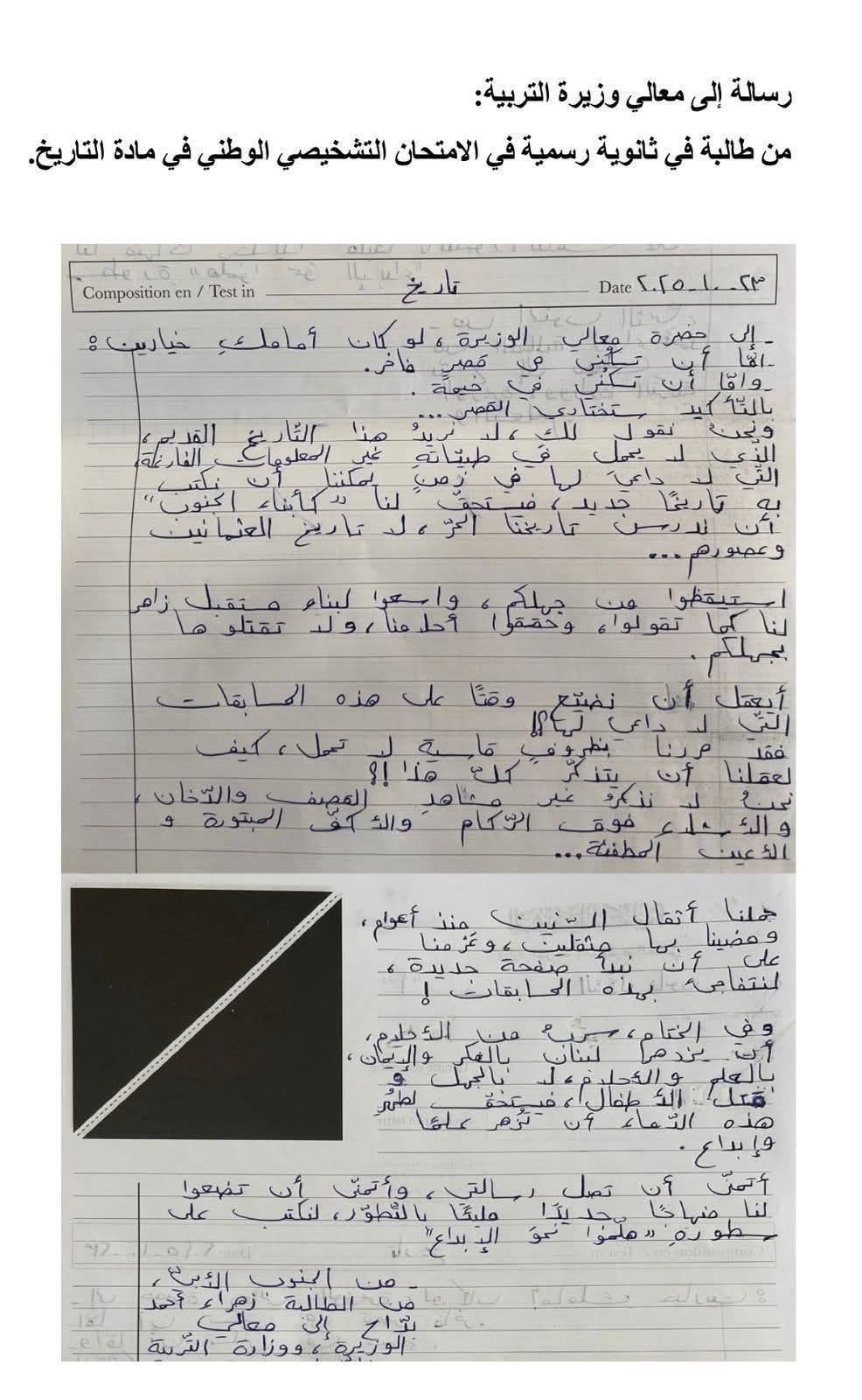 تناقل ناشطون عبر مواقع التواصل الإجتماعي صورة تظهر “ورقة امتحان” لطالبة جنوبية تدعى زهراء بدّاح، كتبت عليها رسالة مُوجّهة إلى وزيرة التربية ريما كرامي بشأن مادة التاريخ.