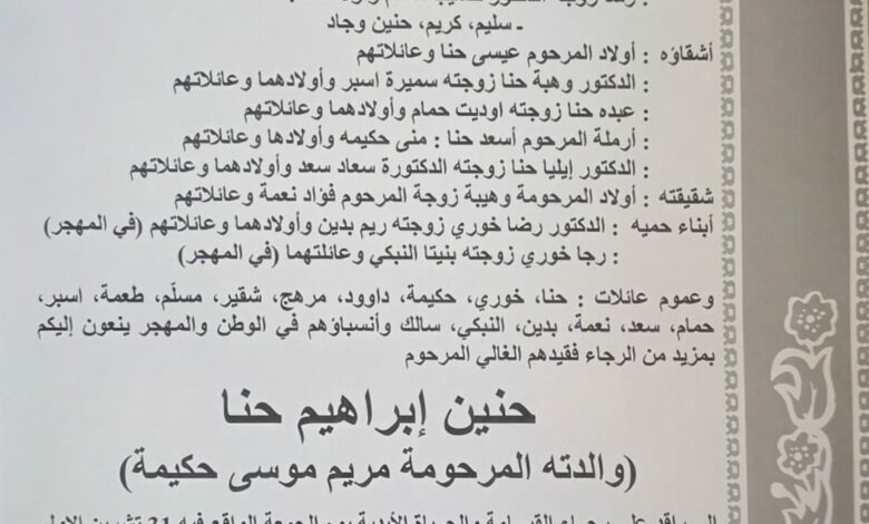 غيّب الموت السيّد حنين ابراهيم حنا، والد زوجة المدير العام لرئاسة الجمهورية أنطوان شقير.