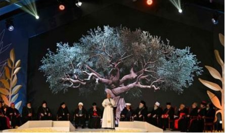 استمع البابا إلى كلمات مرحبة بحرارة بزيارته ومفعمة بالاستجابة لأهدافها من رؤساء الطوائف المسيحية والإسلامية، واختتم اللقاء المسكوني بقيام البابا، يحيط به البطريرك اليازجي والشيخ أبي المنى، بغرس غرسة زيتون قدمها له طفلان، على وقع ترانيم ثم صورة تذكارية بالمناسبة.