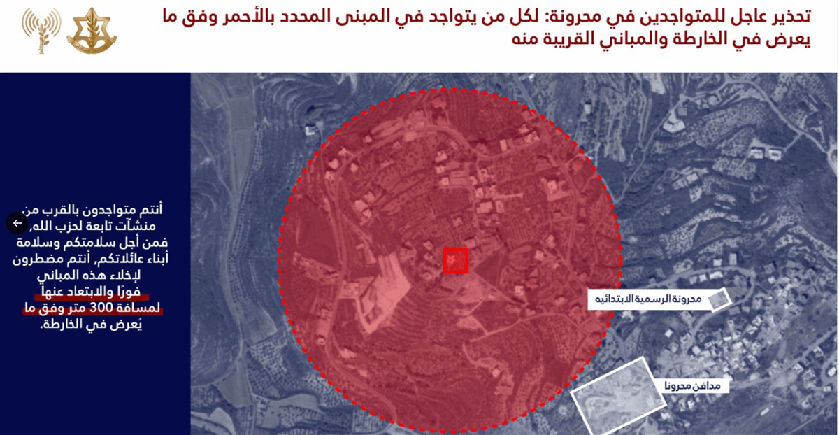 وكان قد طلب الجيش الإسرائيلي من سكان المباني المحددة بالأحمر في الخرائط المرفقة والمباني المجاورة لها في القريتين التاليتين جباع ومحرونة الابتعاد لمسافة لا تقل عن 300 متر.